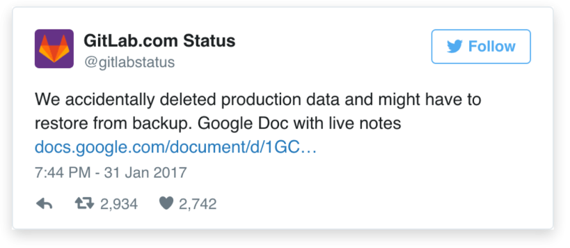 On January 31st 2017, the GitLab site had to be taken down for emergency maintenance. Something bad had happened due to a number of issues occurring and the planned recovery process was thrown out the window because, in their own words: