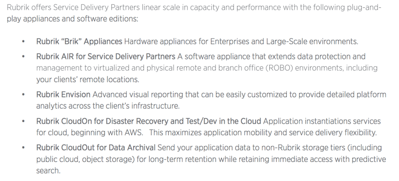 Here are some of the products and services that can be provided by partners by using Rubrik as the enabling technology in the backend: