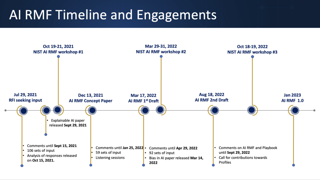 NIST (National Institute of Standards and Technology in the USA) is developing a framework to better manage risks to individuals, organizations, and society associated with artificial intelligence (AI). The NIST AI Risk Management Framework (AI RMF) is intended for voluntary use and to improve the ability to incorporate trustworthiness considerations into the design, development, use, and evaluation of AI products, services, and systems.